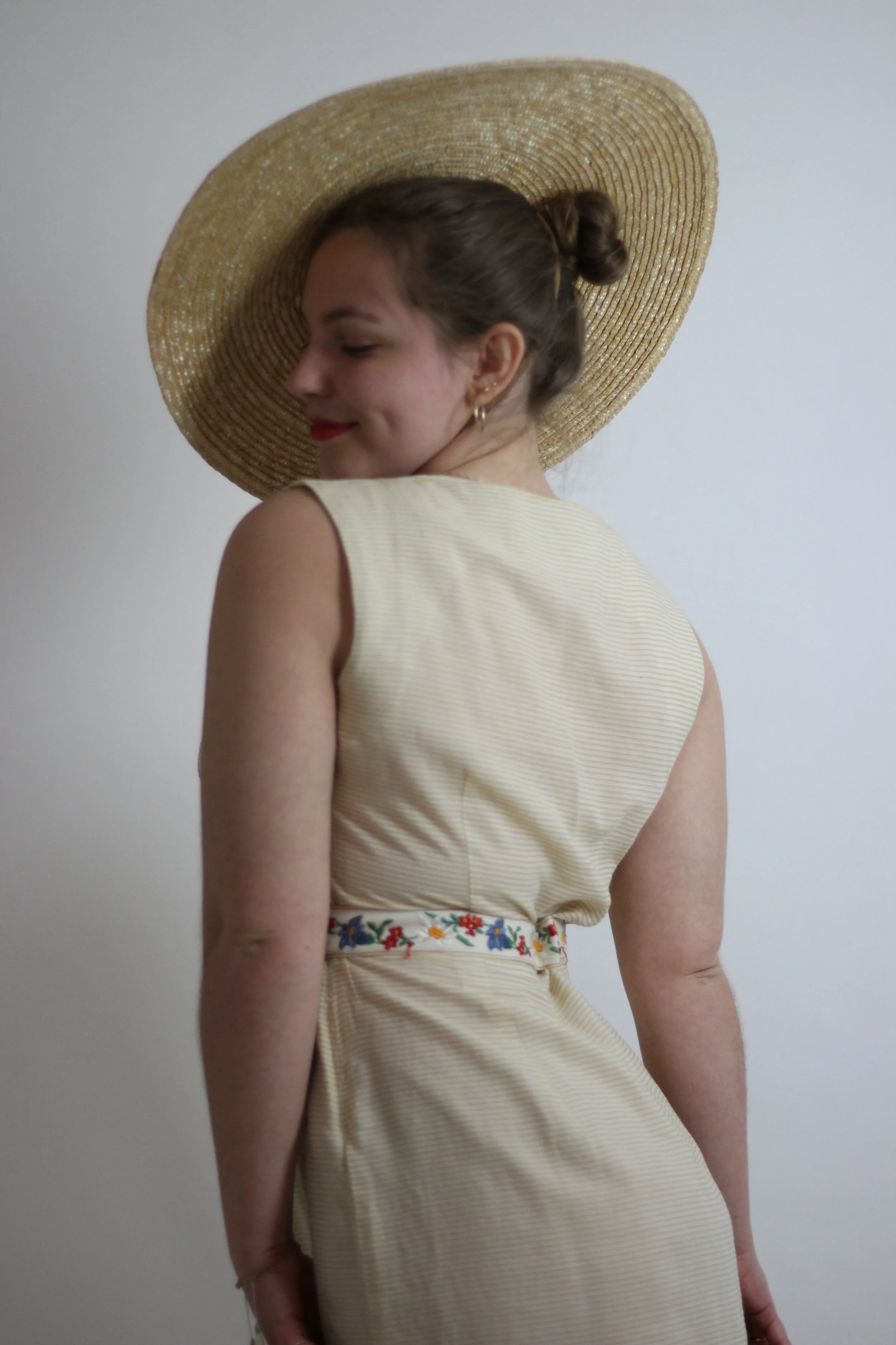Sidste outfit, det er altså bare en klar favorit her. Her har vi taget kjolen hele vejen vintage. En smuk og volumiøs stråhat sat på skrå, et gammelt og delikat bælte, smukke træ-sko og selvfølgelig en vintage-taske. Jeg elsker alt ved det her look, det må jeg bare sige. Det er sjovt, festligt, nede på jorden og skriger "Sommer".