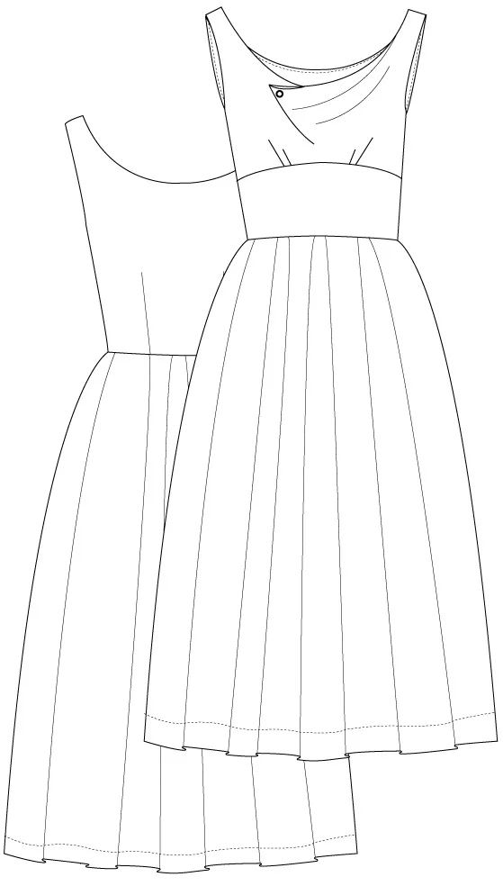 Version 2 er en udringet kjole med vandfald i halsudskæringen. Den har rynk under brystet og talje-bærestykke. Underdelen er vig med wienerlæg hele vejen rundt. Kjolen bliver lukket i siden med en lynlås.