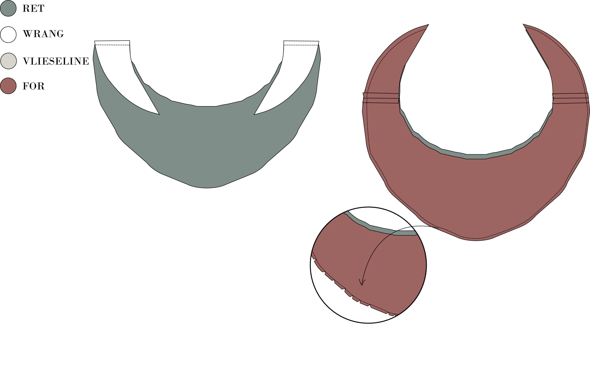 Sy de to skød sammen i den lange buede søm, ret mod ret. Klip hakker i sømrummet og vend.