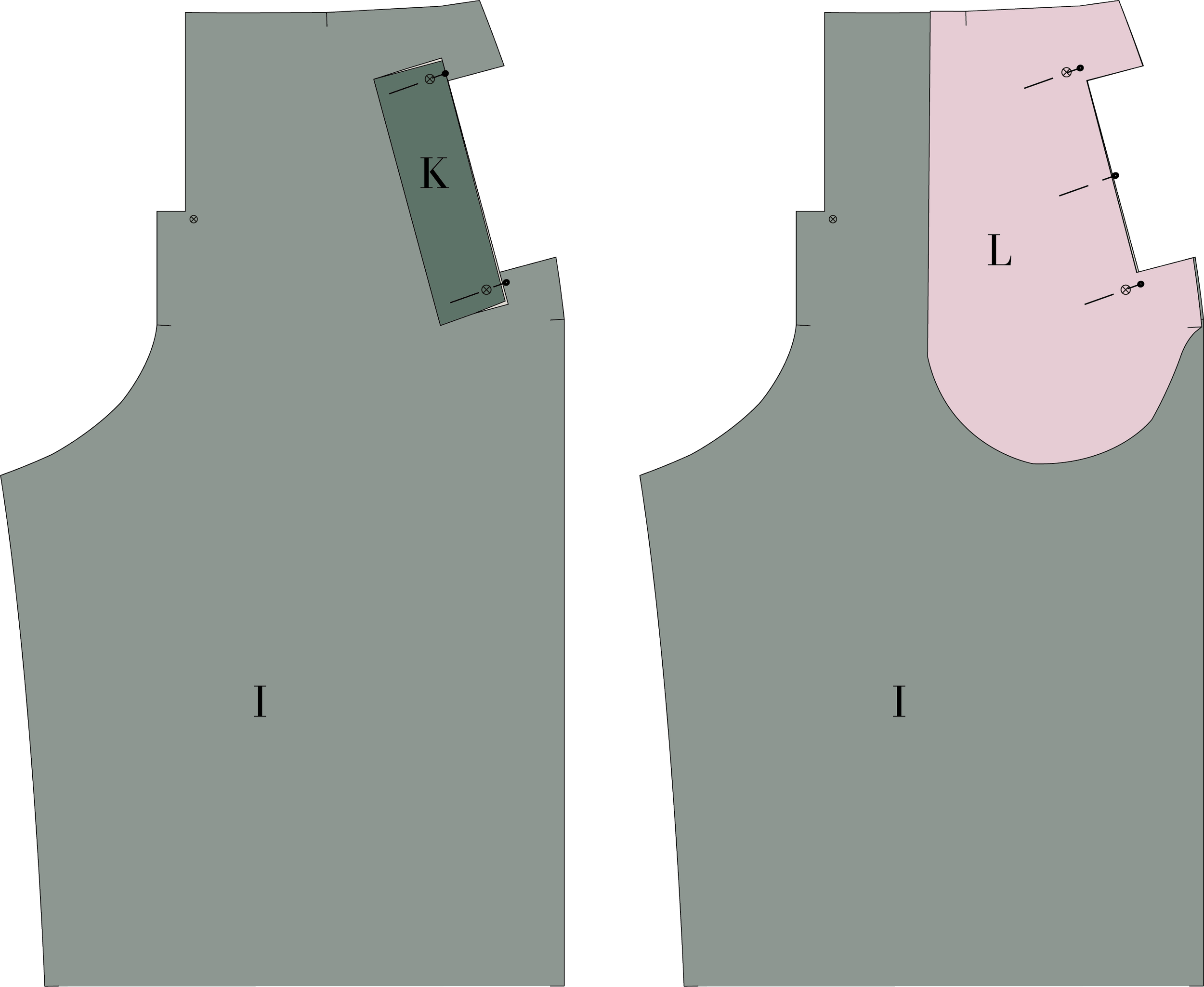 24. Overfør alle markeringer på lommedelene og forstykke (I,K,L)