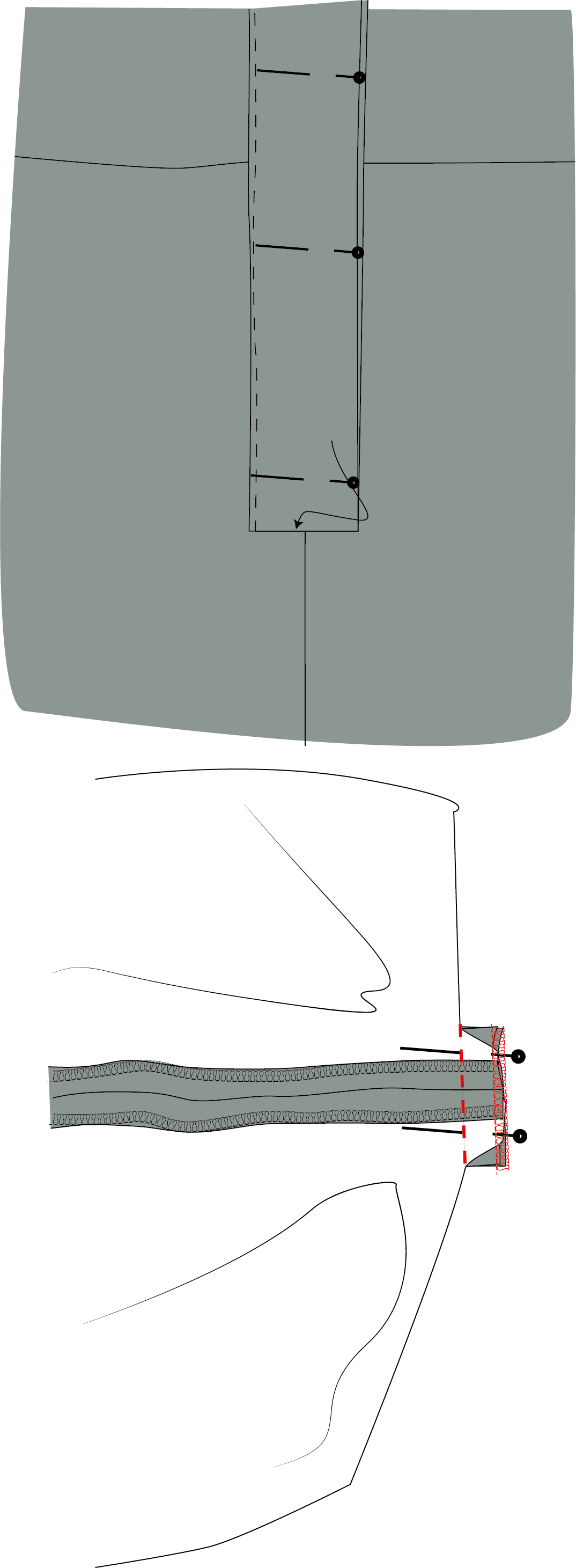 48. Placer den ene stolpe, den side af stolpen med understikning, på vrangsiden af dragtens forkant - ret mod vrang, match markeringerne på stolpen med markeringen på forbuksen og hakket skal passe med sammensyningen mellem buks og top. Stolpen er 1 cm længere end forkanten.