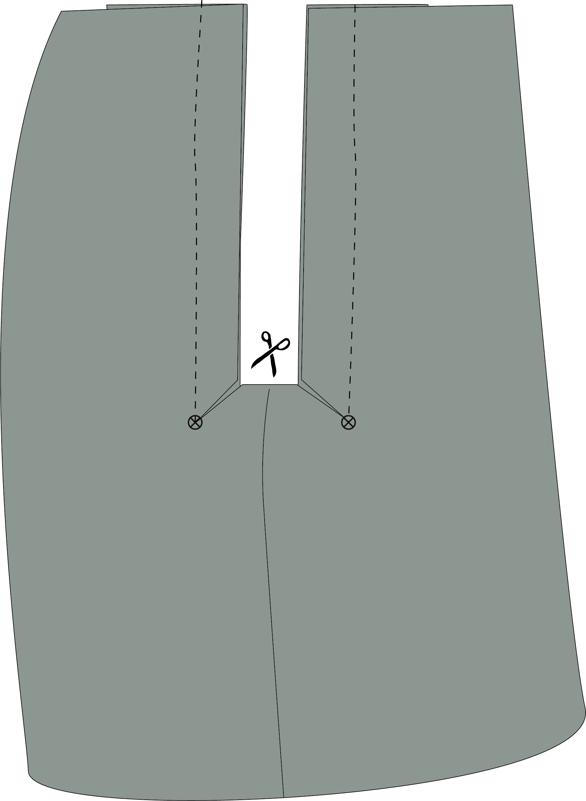 28. Klip ind i hjørnet indtil syningen. Du må ikke klippe i lommepasplen kun i forbuksen og lommepose.