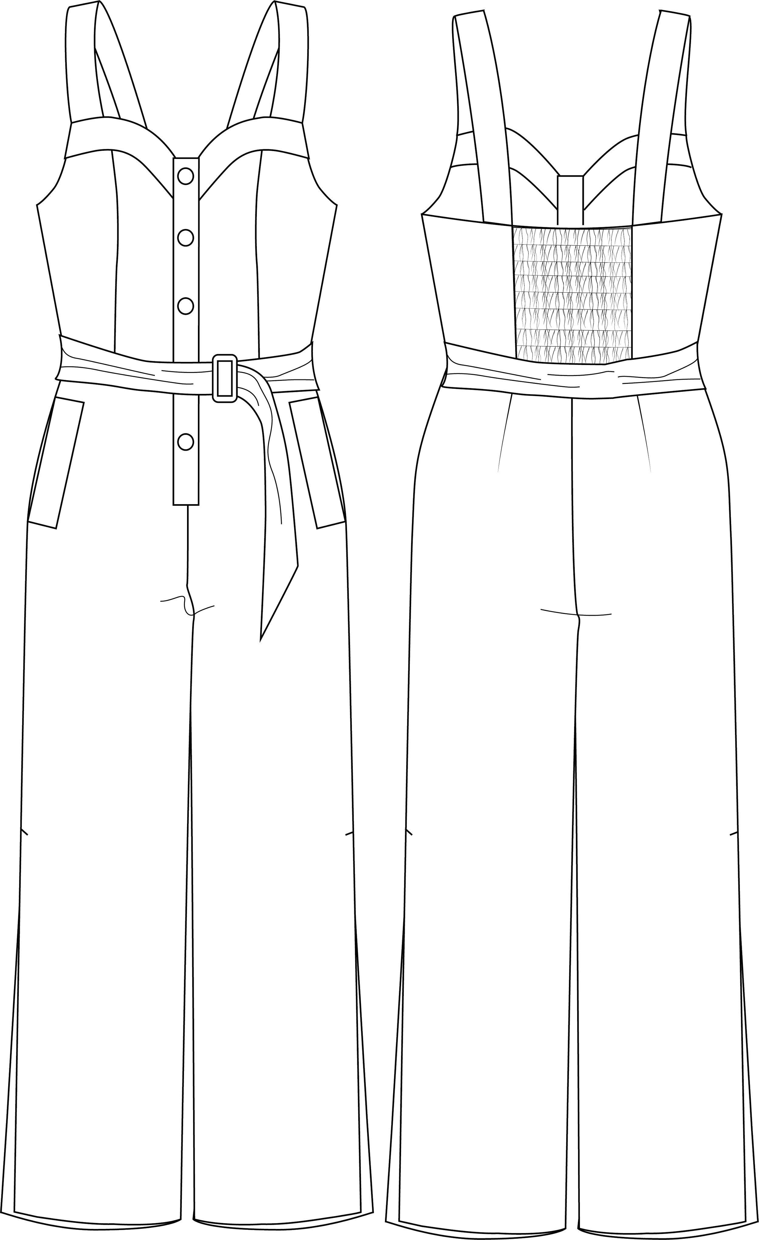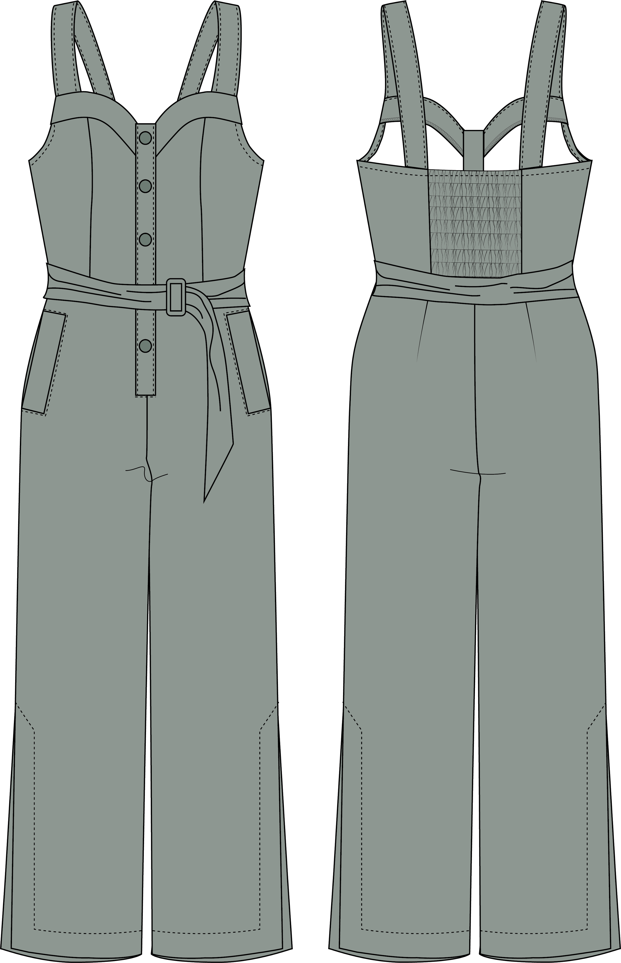 Buksedragt med vide ben og slidser i sidesømmen. Den lukkes foran med en knappet stolpelukning. Modellen har paspel lommer i sidesømmene, maskin-smock på ryggen, en brystdetalje foran og brede skulderstropper.