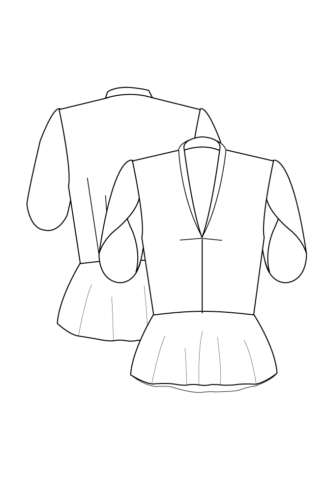 Bluse med skød og tulipan ærme. Den har brystindsnit der ligger som læg i midtfor sømmen, en lille sjalskrave og en skød der er skåret på skrå.